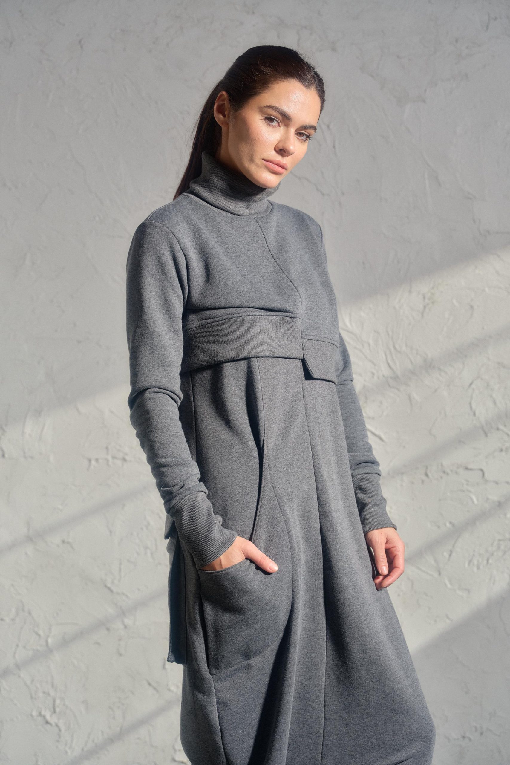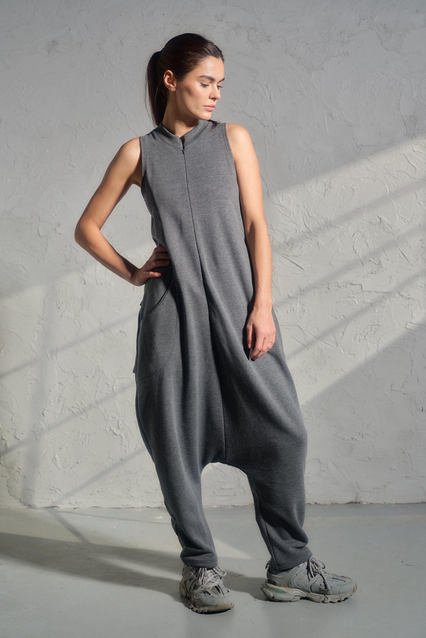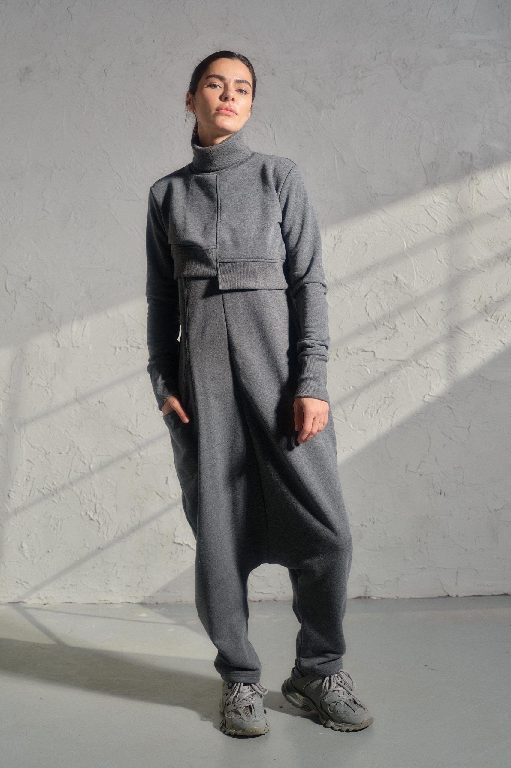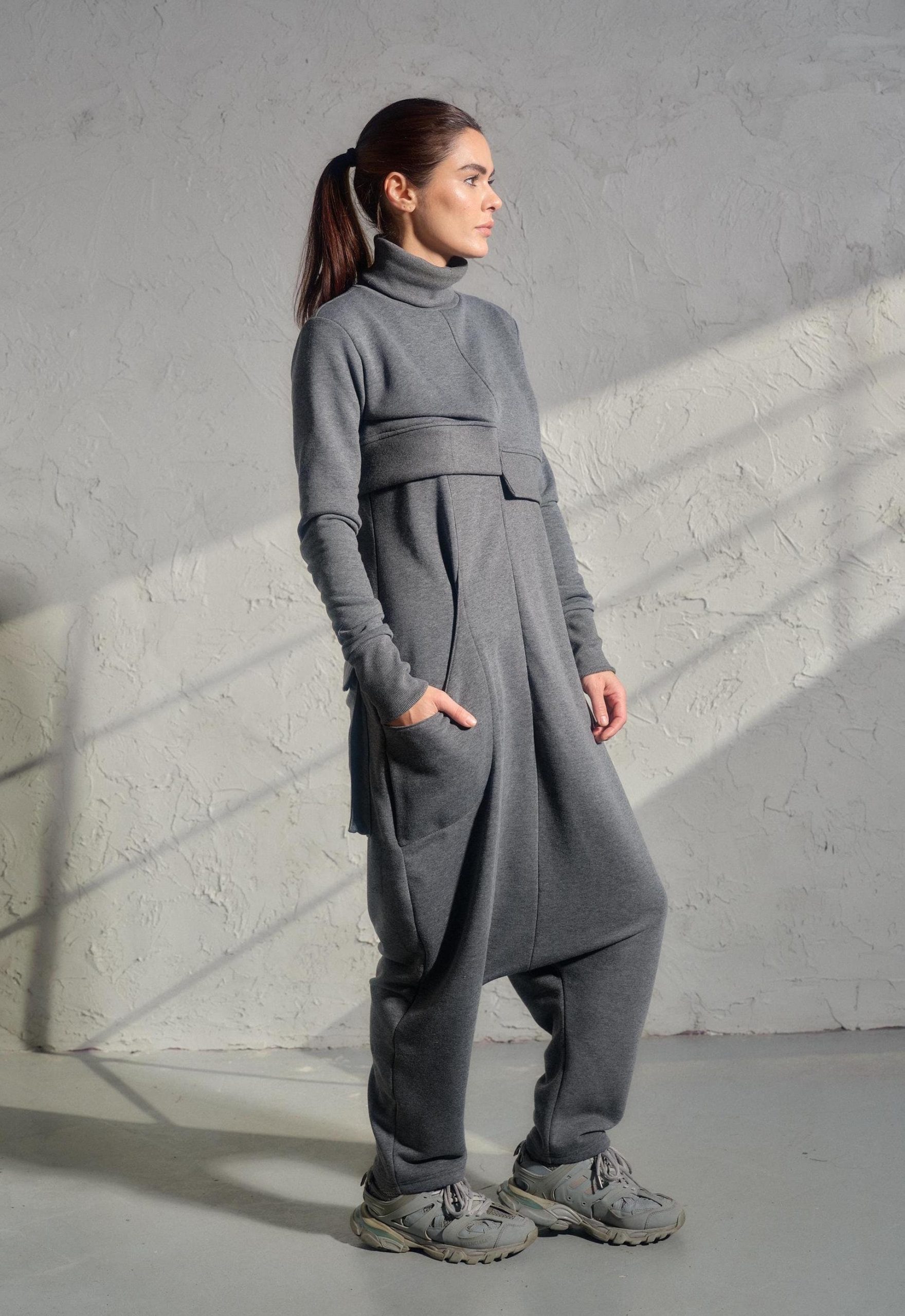 The jumpsuit features a sleeveless tank top design that effortlessly combines with a drop crotch silhouette, resulting in a relaxed, baggy style that’s both comfortable and bold. Asymmetrical pockets appear on the front and back, adding an unexpected urban flair. The cropped sweatshirt adds a playful balance with its asymmetrical hemline, cozy turtleneck, and long sleeves, ensuring the perfect contrast against the jumpsuit’s loose fit and creating a harmonious, trend-forward look.