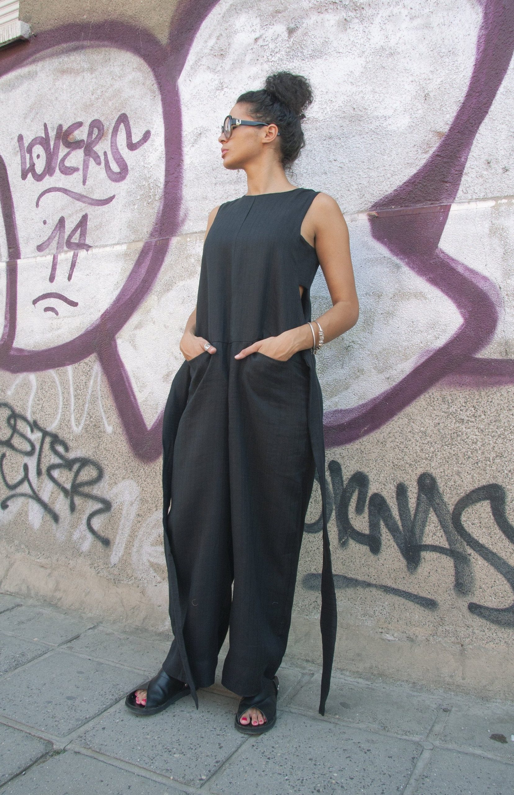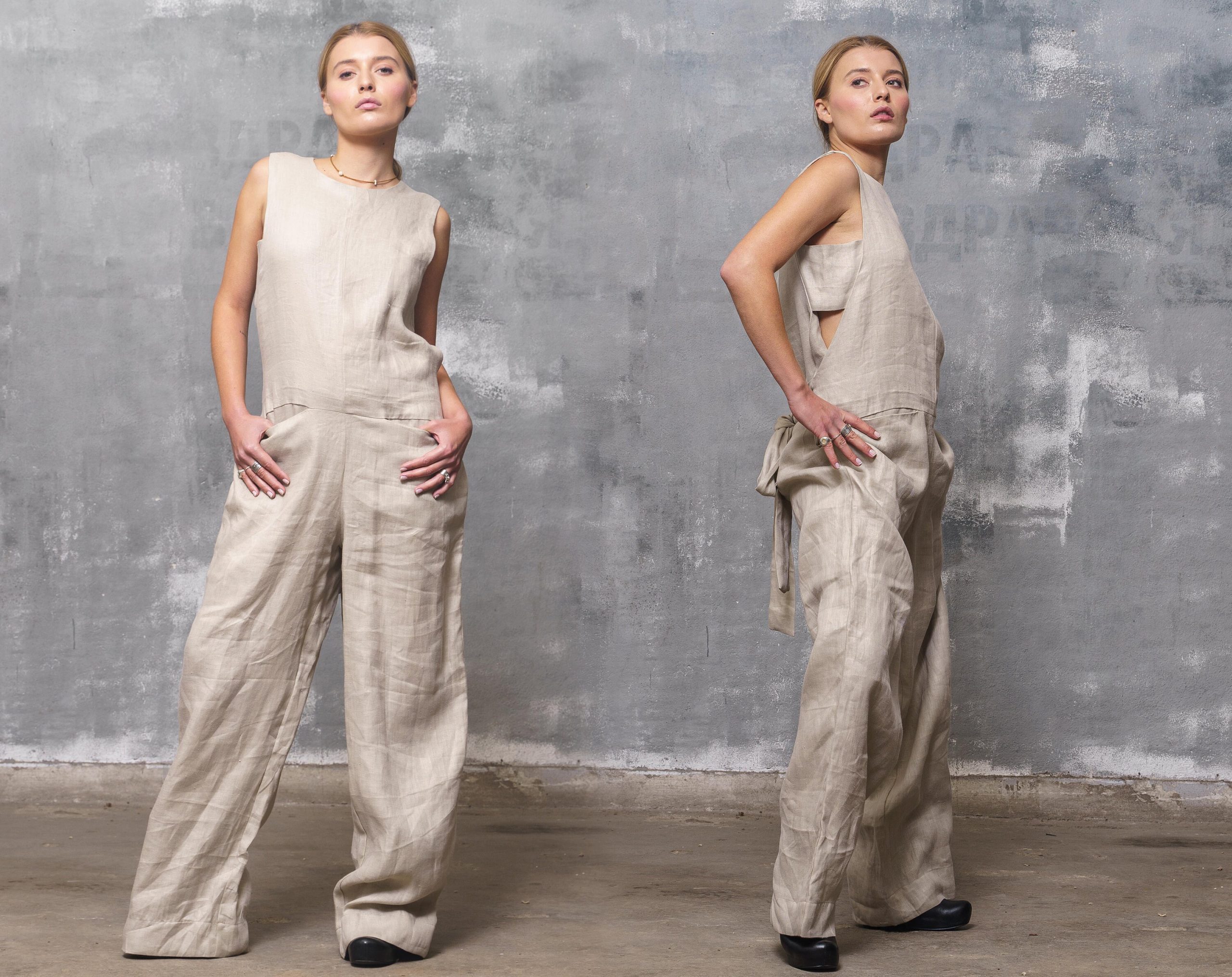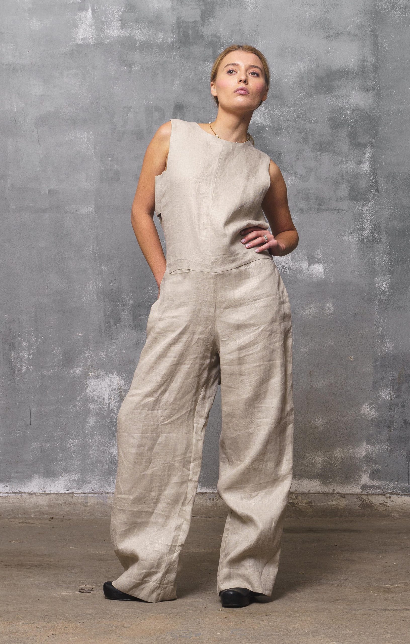 Beige Linen Jumpsuit: Sleeveless Wide Leg Overalls Plus