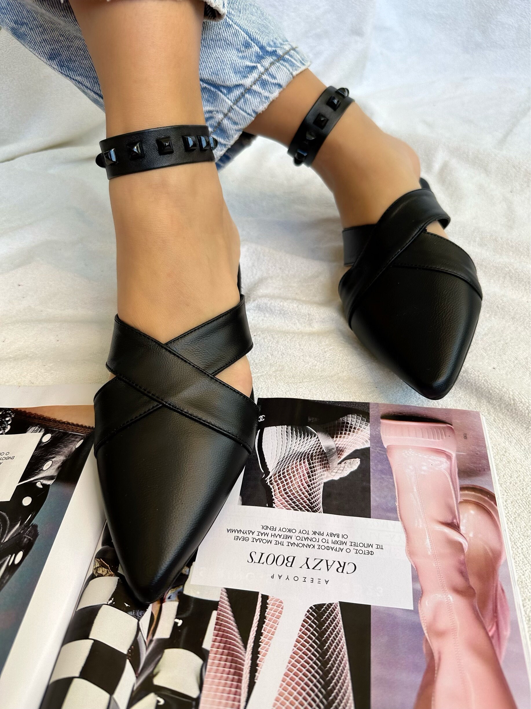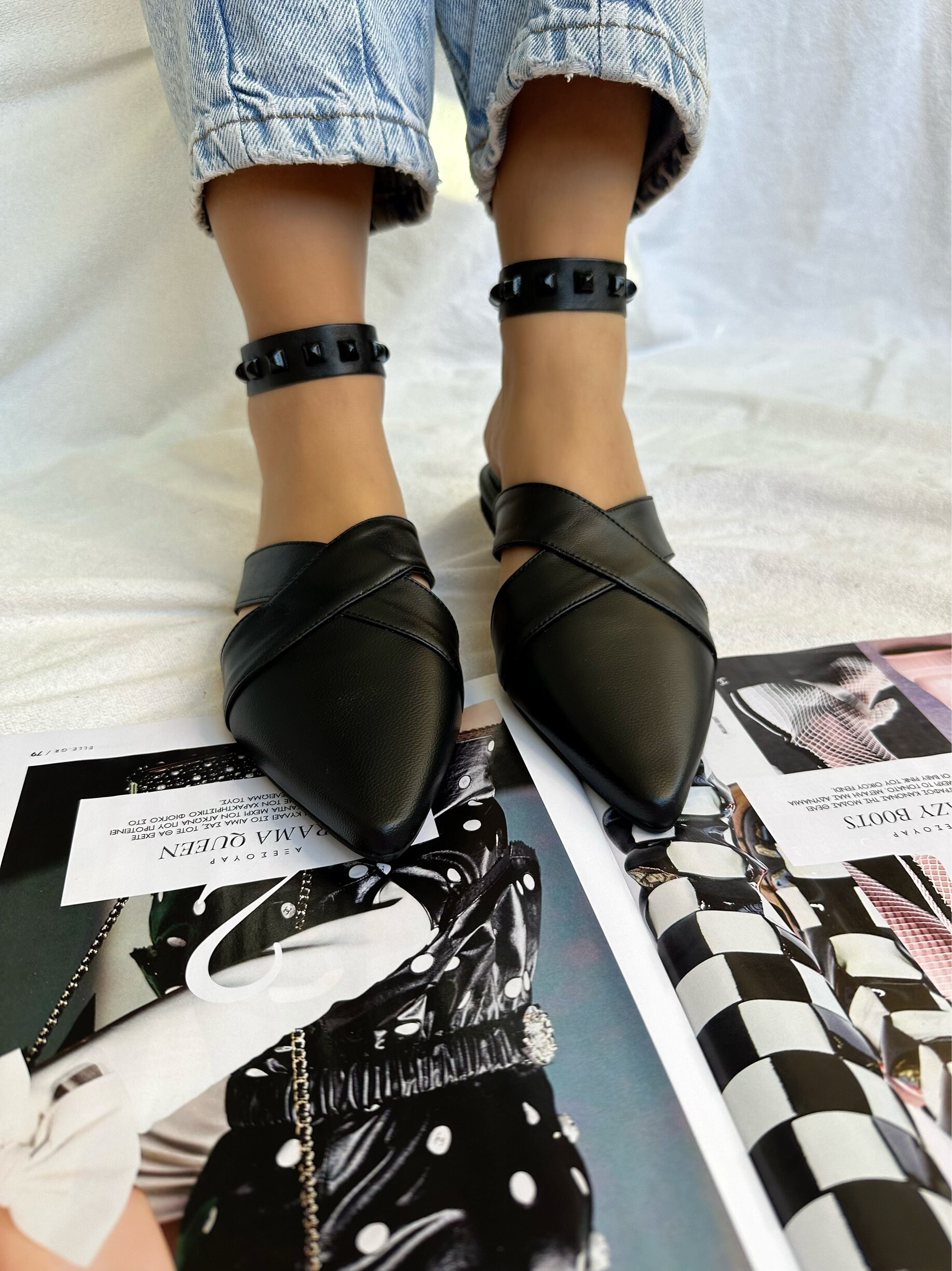 A Black pair of Leather Mules that is made from Full Grain Leather in Greece. I also created a pair of anklets that are made from faux leather with black rhombus charms and create a special combination with this special pair of shoes. The sole is comfortable while walking and they are lightweight. The criss cross straps of the upper side are tight and after some tries they take the fit of your feet and they give extra comfort. You can choose to purchase them with or without anklets. You can also find them in black color at the same design. Find them only at our Store.