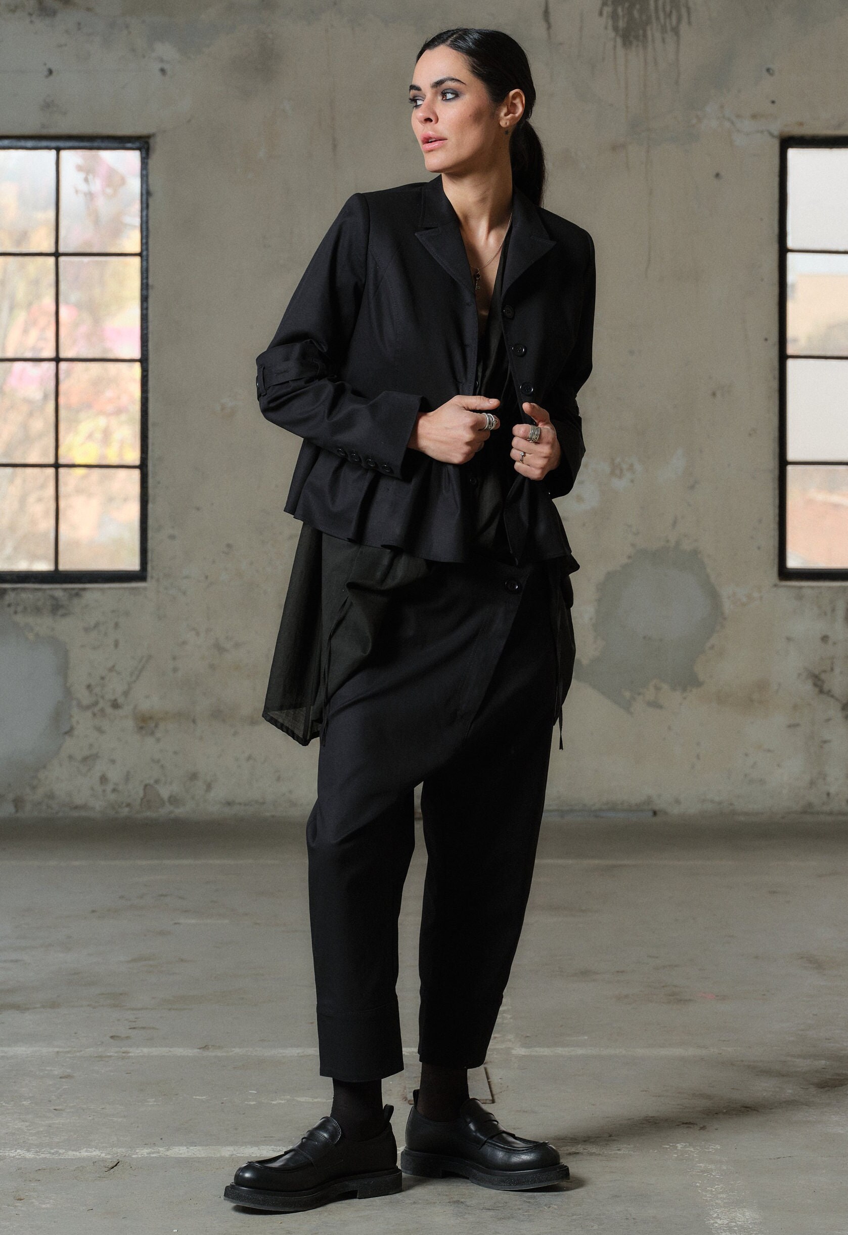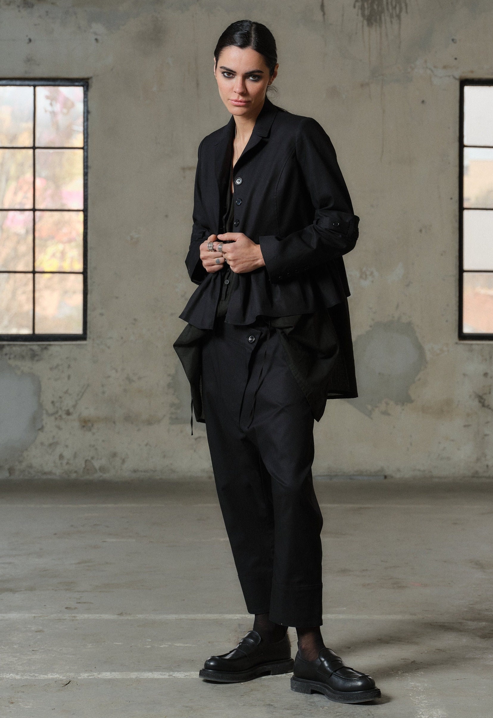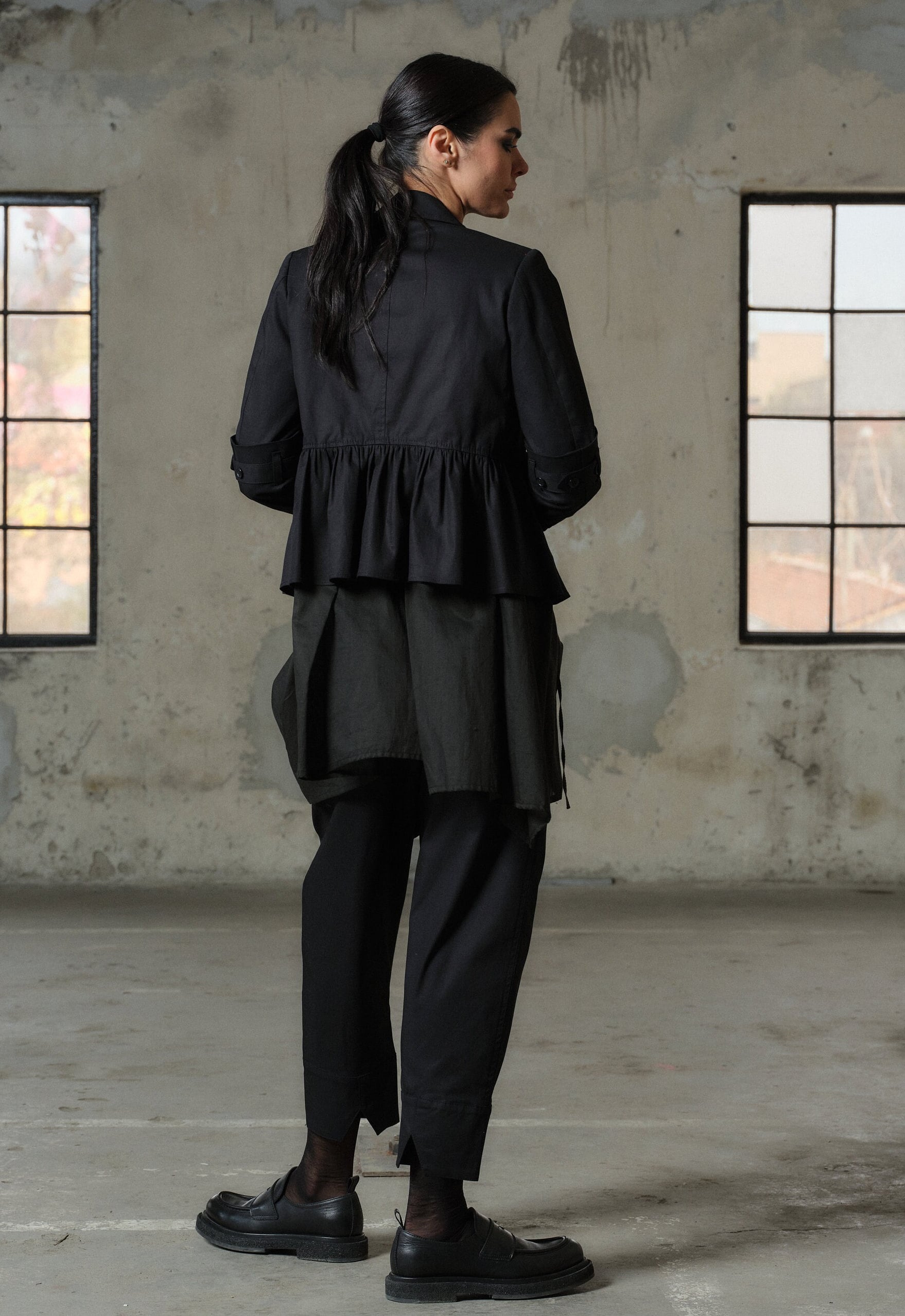Elevate your wardrobe with our Avant Garde Black Peplum Blazer. Designed for the modern woman who values style and sophistication, this fall cotton jacket features intricate ruffles and a flattering peplum cut that highlights your waist. Whether you’re dressing for a business meeting, a casual outing, or a formal event, this blazer is your go-to piece for a polished and elegant look.