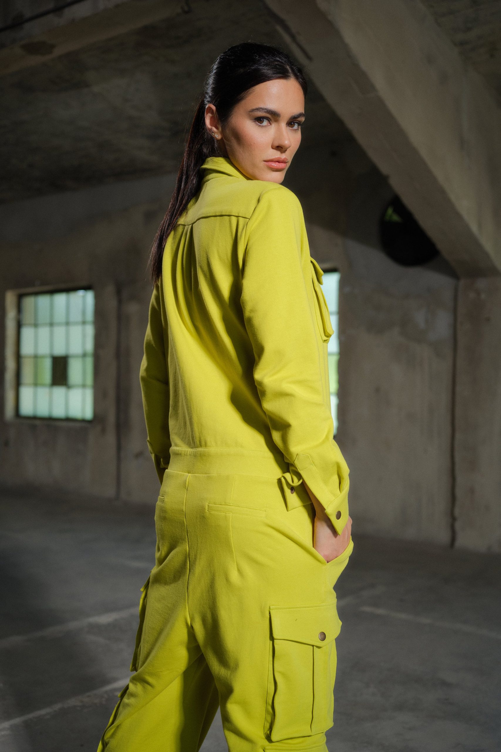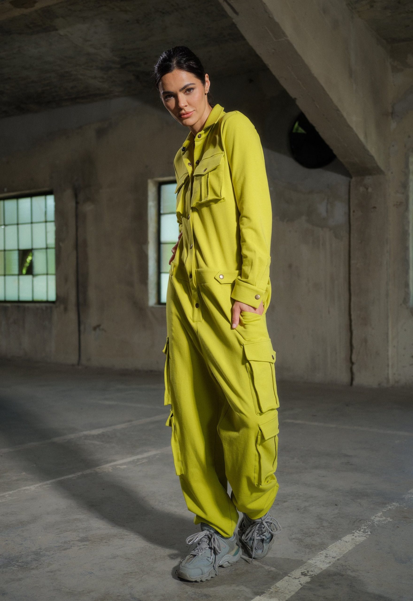 Handmade Lemon Green Cotton Utility Jumpsuit: Plus Sizes