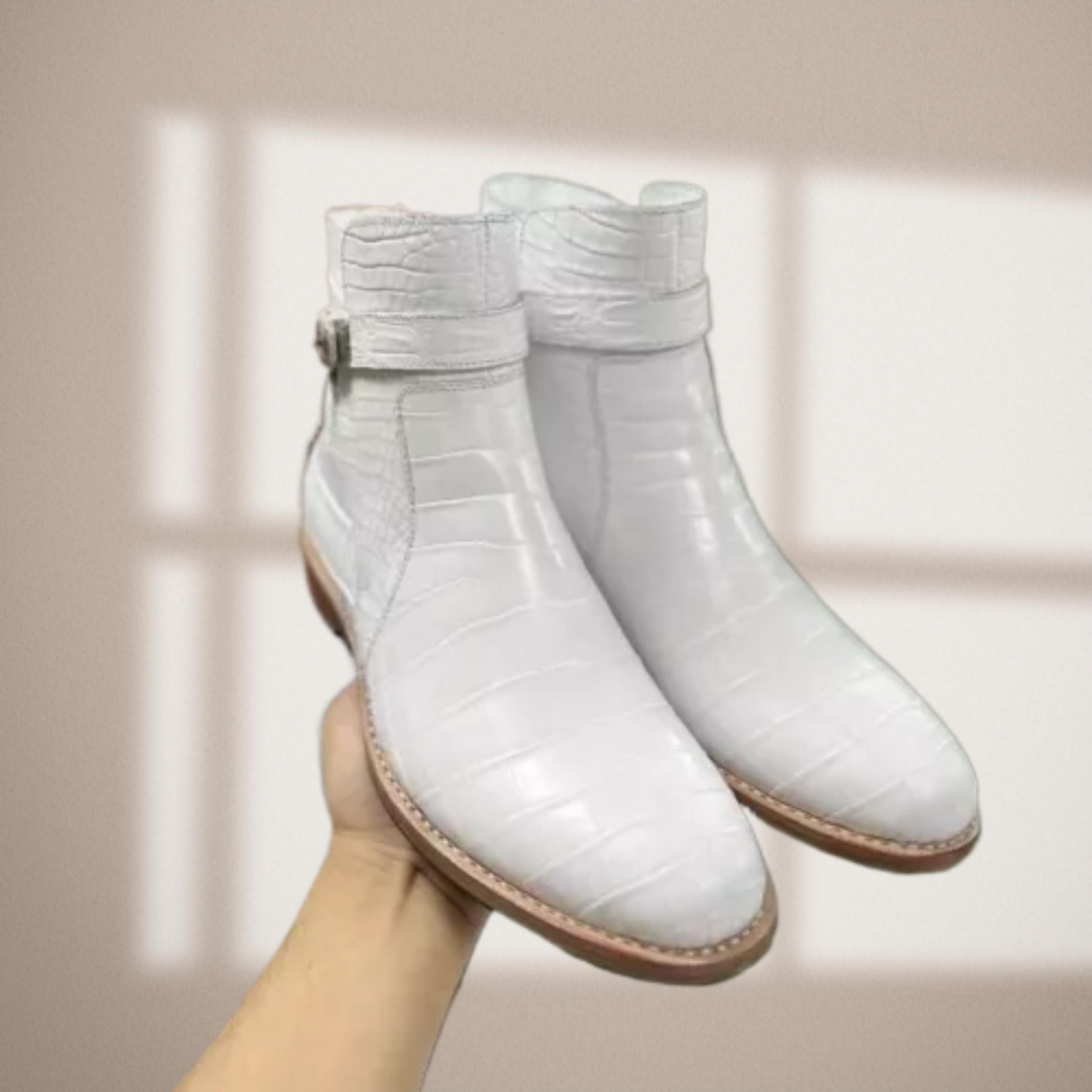 Men’s Handmade Long Leather Boots White Pattern Buckle